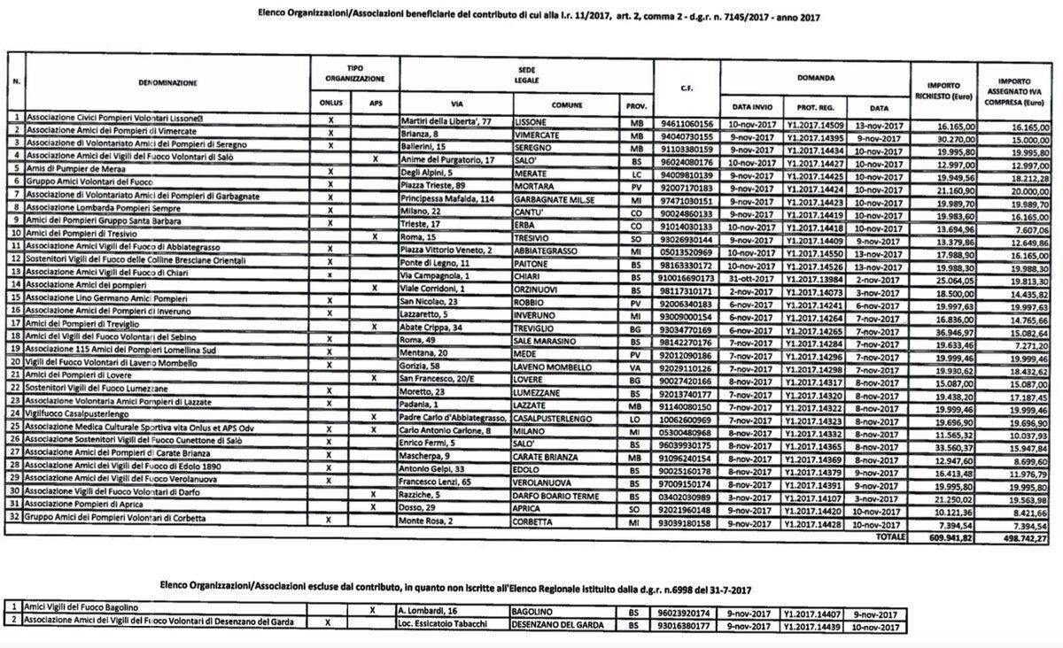 Lo stesso vale per l’Associazione volontaria Amici dei pompieri di Lazzate: aveva chiesto 19.999 euro e le sono stati riconosciuti tutti. Una somma che dovrà servire per migliorare le attrezzature della caserma.