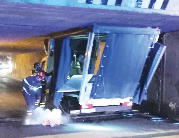 Il mezzo evidentemente è arrivato veloce, poiché la parte anteriore del cassone si è piegata e il mezzo si è infilato nel sottopasso restando incastrato.