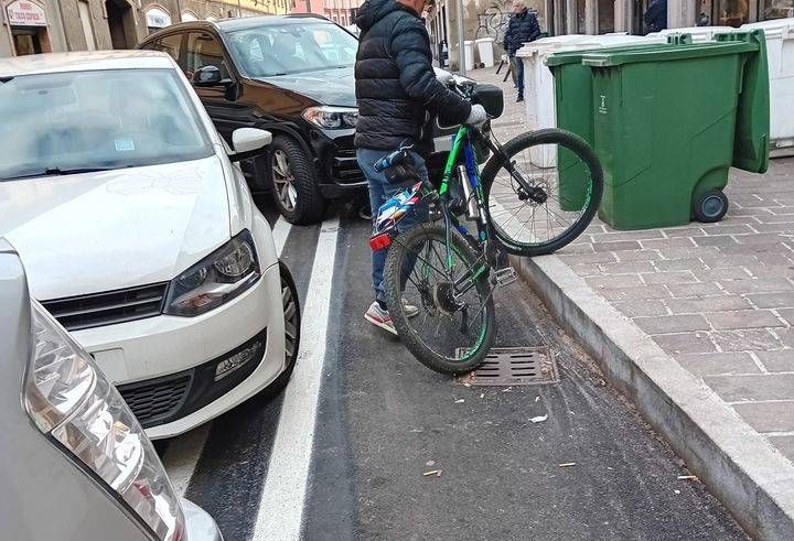Auto parcheggiate di traverso che bloccano completamente la ciclabile, costringendo i ciclisti a vere e proprie acrobazie, così come accade per i furgoni delle consegne.