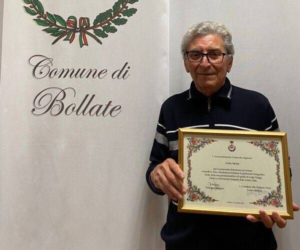 “L’Amministrazione Comunale ringrazia Giulio Mesini – si legge nella pergamena conferita – per la generosità dimostrata nel donare, a beneficio della cittadinanza bollatese, il patrimonio fotografico frutto della sua professionalità e di quella di Luigi Origgi, storici e riconosciuti fotografi della nostra Città“.