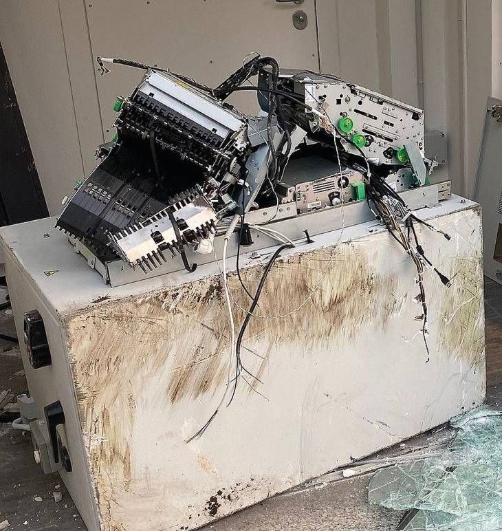I ladri hanno dapprima agganciato e sradicato il serramento che chiudeva l’accesso al locale in cui si trova lo sportello bancomat, dopo di che, non si sa se usando un braccio meccanico o un cavo, hanno sradicato la cassaforte contenente i soldi del bancomat e hanno cercato di caricarla sul mezzo con cui erano arrivati.
