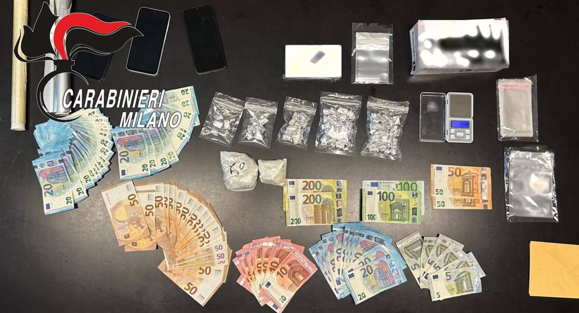 Dalla successiva perquisizione domiciliare, i Carabinieri hanno rinvenuto in un armadio altri 110 grammi di cocaina suddivisi in due involucri, due bilancini di precisione, materiale vario per il confezionamento e 2.170 euro in banconote di vario taglio.