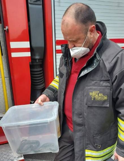 Anche i biacchi però possono morsicare, per cui i pompieri hanno agito con molta attenzione per evitare sia di essere morsi sia di far cadere il rettile nei box.