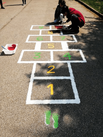 I giochi di una volta che si disegnavano con i gessetti, sono stati scritti con la vernice e il risultato è ottimo.