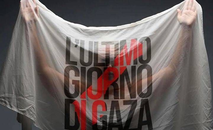 Lenzuola che alludono ai sudari che avvolgono, a Gaza, i corpi dei bambini, delle donne e degli uomini palestinesi uccisi dai bombardamenti israeliani.