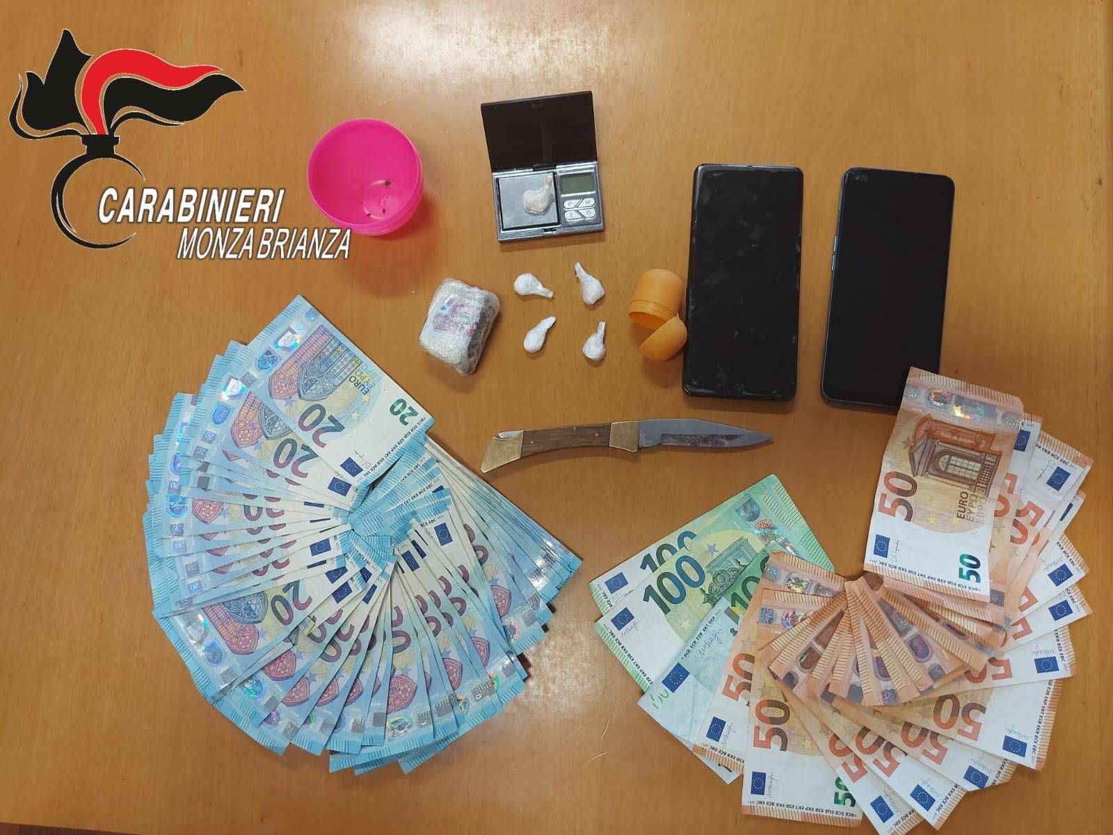 I carabinieri chiedono i documenti e decidono di approfondire il controllo. I due soggetti, entrambi tunisini, rispettivamente di 36 e 37 anni, dimostrano insofferenza e le ragioni appaino presto chiare. Dal controllo emerge che l’autovettura era stata appena asportata dall’interno di una corte del piccolo comune brianzolo, e all’interno della stessa sono stati rinvenuti e sequestrati 2,7 grammi di cocaina suddivisi in 5 dosi e banconote per complessivi 2.540 euro, ritenuti il provento dell’illecita attività di spaccio condotta durante la serata appena trascorsa, un bastone in legno ed coltello.