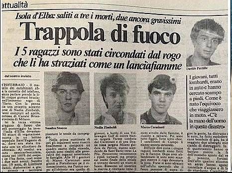 I giovani, che stavano trascorrendo insieme le vacanze estive, furono colti di sorpresa e accerchiati da un incendio improvviso, alimentato dal vento di libeccio; il rogo non lasciò loro alcuna via di scampo e i soccorsi furono inutili. Le vittime erano Sandro Stocco, 19 anni di Limbiate; Marco Alessandro Carminati, 19 anni di Milano; Nadia Zimbaldi, 20 anni, studentessa di Carate Brianza; Emanuele Casati e Davide Pertile, entrambi 19enni limbiatesi.
