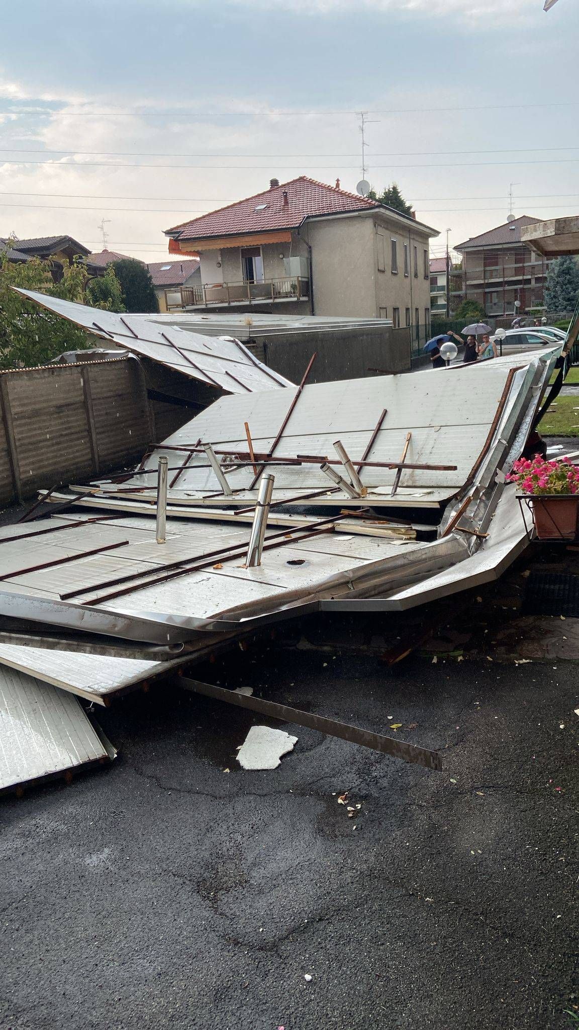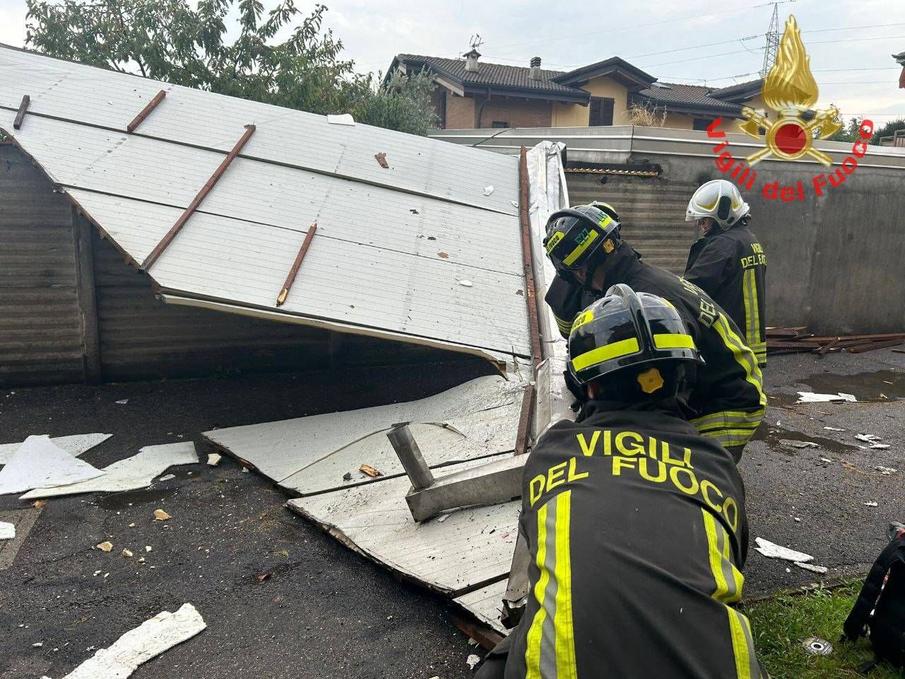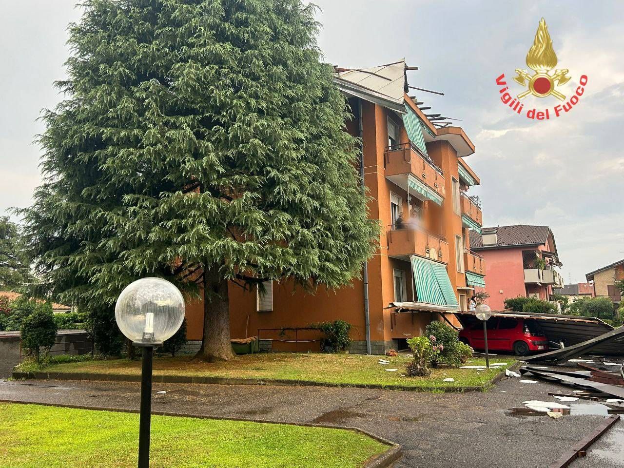 L’episodio più grave a Ceriano Laghetto, in via Stra Meda, dove una copertura di lamiera si è sollevata dal tetto di un condominio di 4 piani ed è precipitata a terra nel cortile interno, colpendo delle auto.