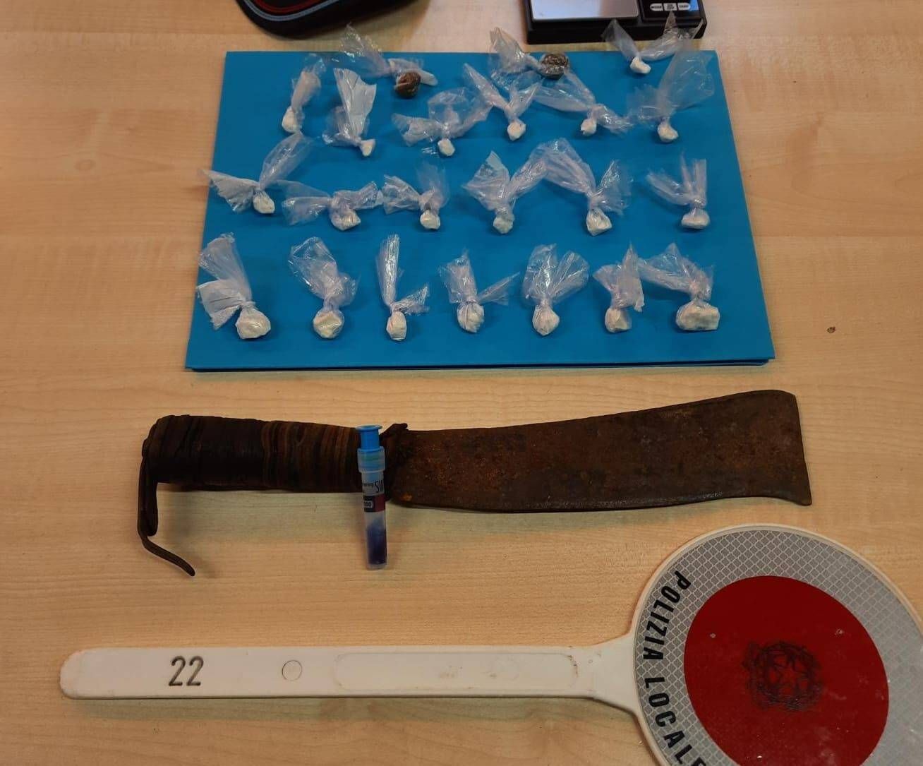 22 dosi di stupefacente confezionate e pronte ad essere vendute, ed un machete. È quanto sequestrato nella giornata di ieri dalla Polizia Locale.