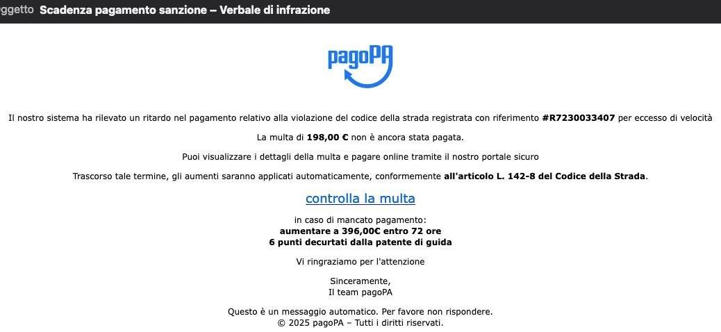 • Importo realistico e minaccia di raddoppio: la mail indica una presunta multa da 198,00 €, minacciando che, in caso di mancato pagamento entro 72 ore, l’importo salirà a 396,00 € con l’aggiunta di una decurtazione di 6 punti dalla patente.