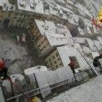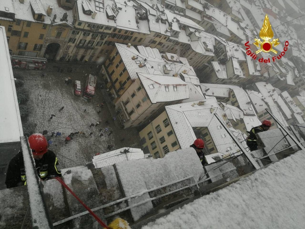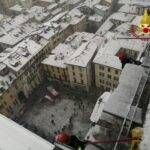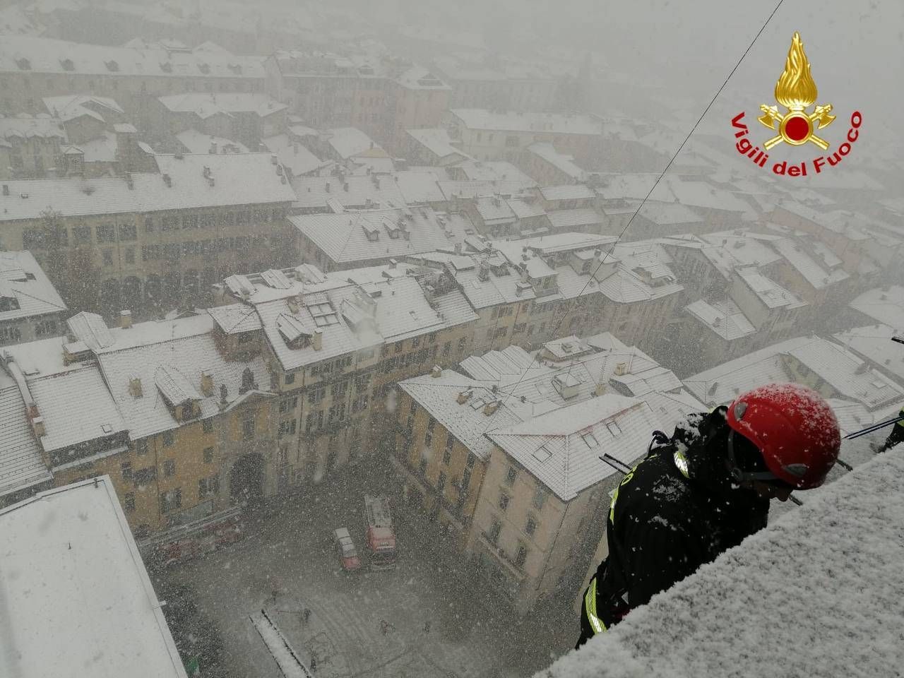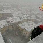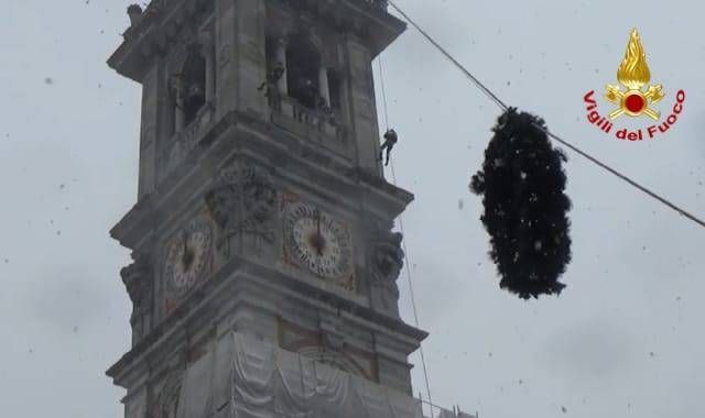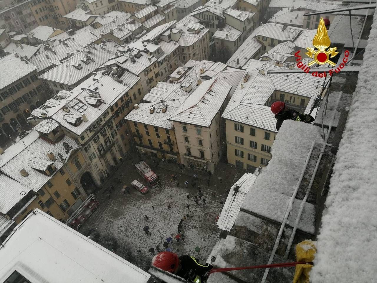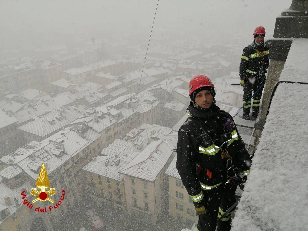 In una cornice particolare, vista la nevicata in corso, gli specialisti del S.A.F. (Speleo Alpino Fluviale) dei vigili del fuoco hanno sfidato i 77,91 metri del campanile del Bernascone, collocando sulla cima la corona, con la preghiera a protezione della città.
