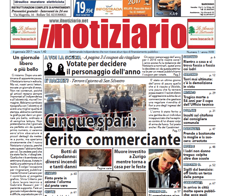 Questo primo numero del 2017 lo apriamo mettendo sotto la lente quanto accaduto sabato pomeriggio a Uboldo. E' stato un ultimo giorno dell'anno di paura quello che si è vissuto a Uboldo, una paura che fa temere possa esserci il racket dietro all'aggressione subita da un commerciante che gestisce una regolare rivendita di fiori a uno degli ingressi del cimitero. L'uomo è stato ferito a una gamba da un individuo incappucciato che ha esploso contro di lui diversi colpi di arma da fuoco.