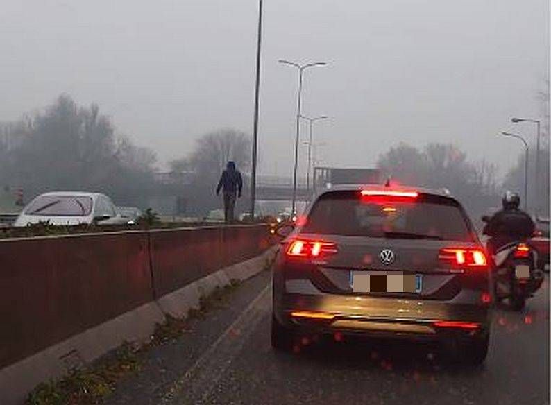 Il pedone irresponsabile è un soggetto sui 30/40 anni, che attraversa prima la carreggiata Sud, poi cammina sullo spartitraffico ed infine attraversa la Nord. Alcuni automobilisti hanno anche rallentato per farlo passare, in modo da allontanare al più presto il pericolo.