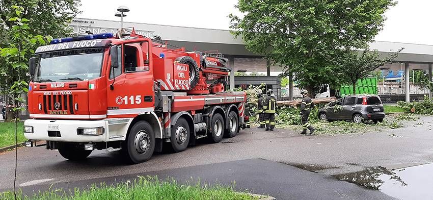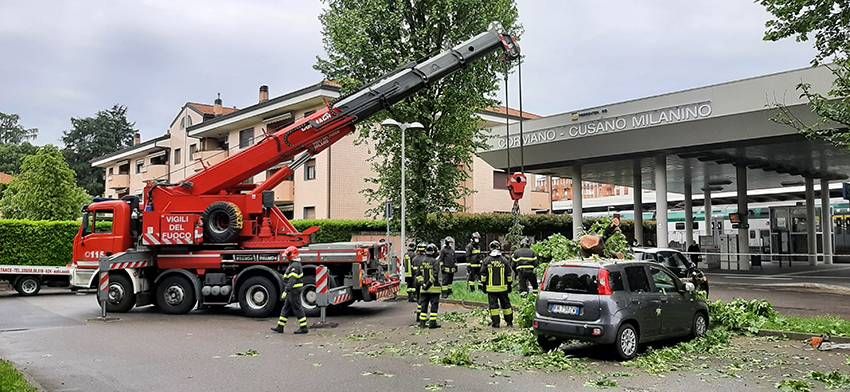 Un grosso albero è precipitato oggi pomeriggio a Cormano davanti alla stazione ferroviaria, danneggiando seriamente diverse auto in sosta.