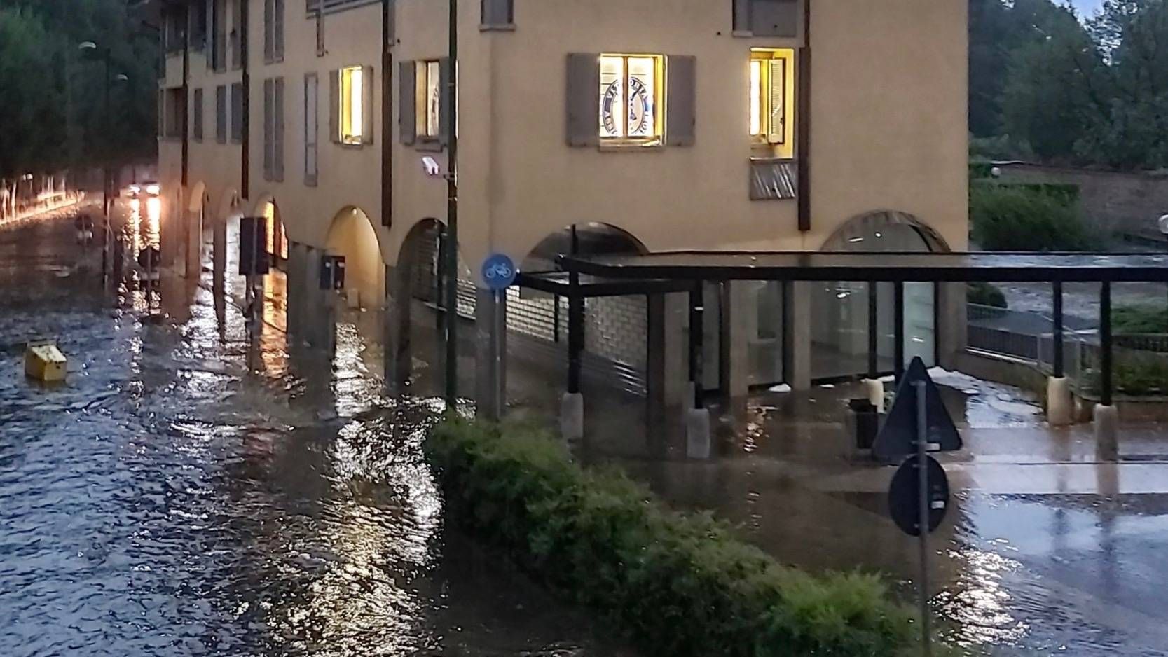 Il centro di Dugnano dove confluiscono in piazza Matteotti le vie Grandi, Buozzi e Gramsci si è trasformato in un grande fiume. In alcuni punti l’acqua che si è accumulata sulla carreggiata ha superato i 15 centimetri.