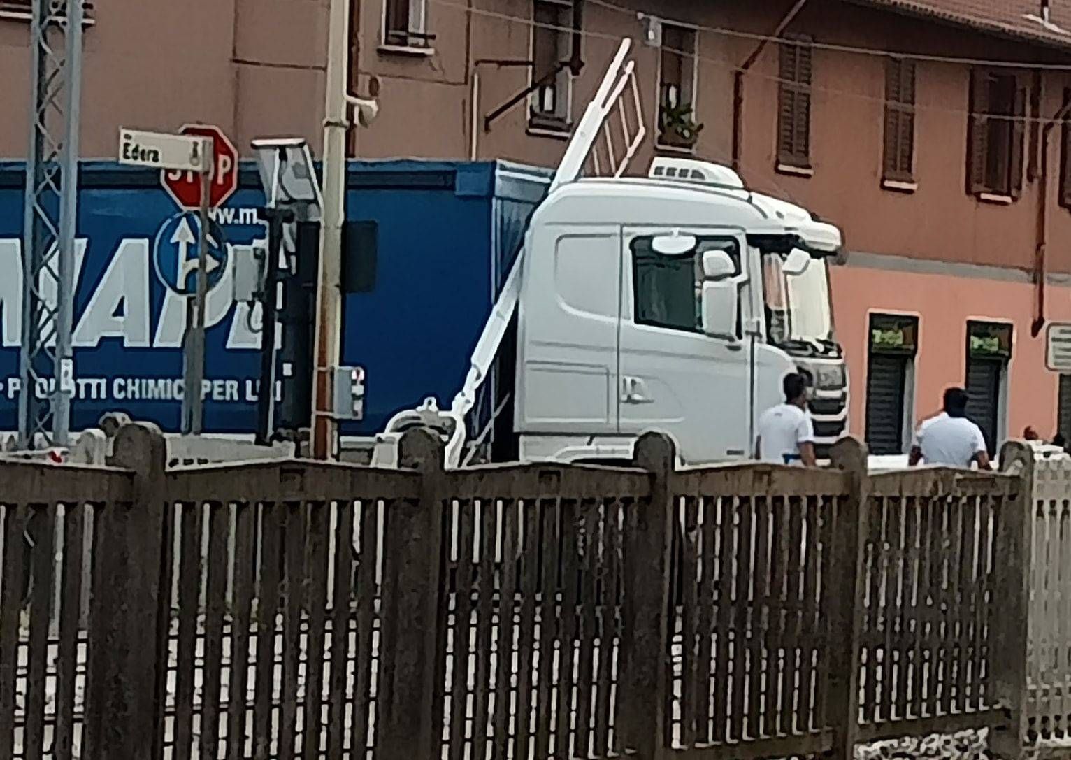 Un grosso camion è rimasto incastrato tra le sbarre del passaggio a livello a Paderno Dugnano, bloccando la circolazione dei treni sulla linea Milano-Asso.