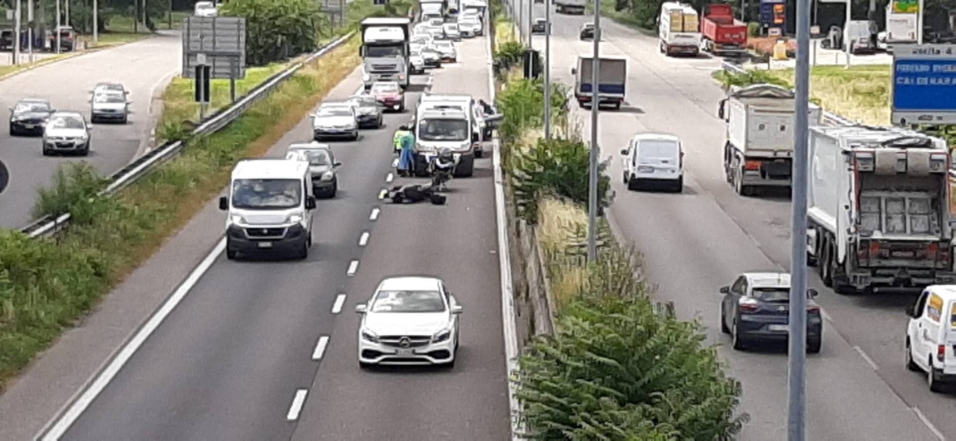 Secondo una primissima ricostruzione entrambi i veicoli si trovano nella corsia di sorpasso della superstrada e la causa dell’impatto sarebbe un tentativo di sorpasso azzardato della moto nei confronti dell’auto. Sul posto dell’incidente sono giunti immediatamente i soccorsi con un’ambulanza e un’automedica, chiamati inizialmente ad un intervento in codice rosso: il motociclista, un uomo di 47 anni, è stato scaraventato a terra e all’arrivo del 118 si trovava ancora privo di coscienza. La situazione si è poi evoluta positivamente e l’uomo è stato trasportato in ospedale in codice giallo.