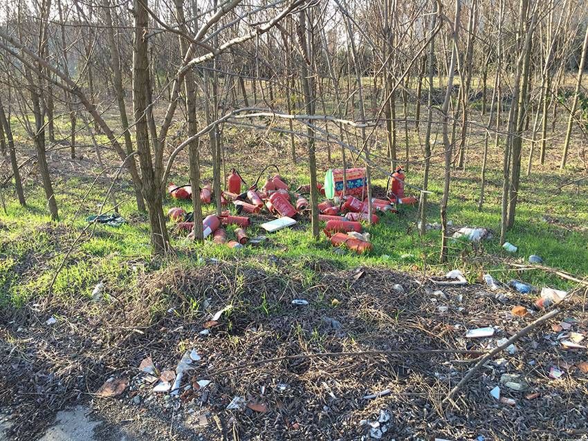 Sì, una quarantina di estintori rossi di quelli che si usano negli uffici, nelle aziende e negli edifici pubblici, sono stati gettati in mezzo alla boscaglia a una decina di metri dal margine stradale.
