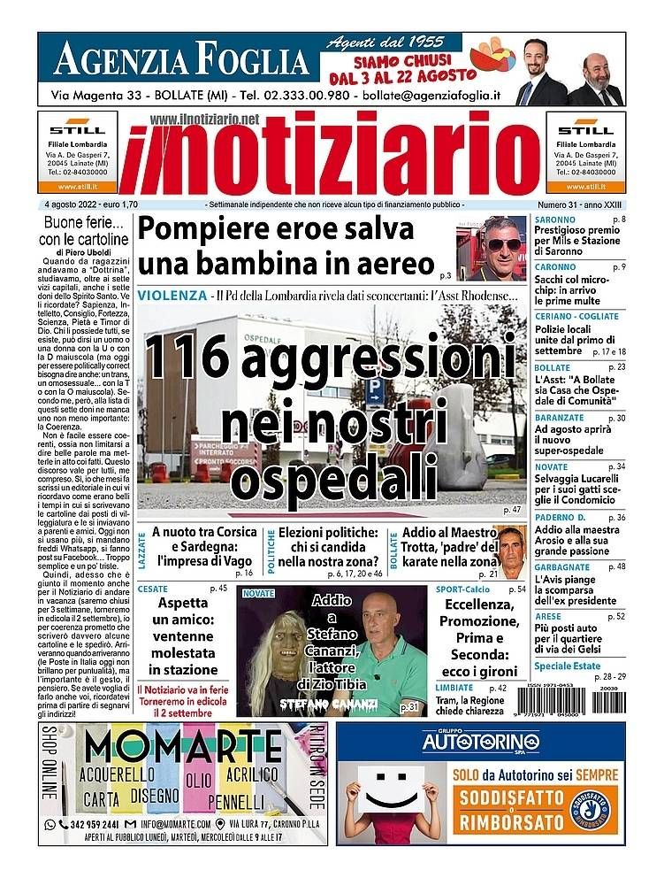 L’edizione del 4 agosto del Notiziario, ultimo numero prima della sospensione per le vacanze estive, si apre con un dato allarmante: ben 116 aggressioni nei nostri ospedali, con quello di Garbagnate in cima alla classifica.