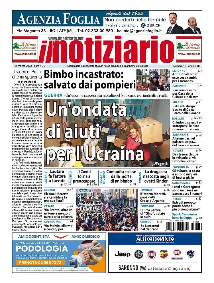 La nuova edizione del Notiziario si apre con la straordinaria dimostrazione di generosità registrata in questi ultimi giorni in tutti i nostri comuni per i profughi dell’Ucraina. A cominciare dalla raccolta di medicinali e generi primari organizzati dal Notiziario nella nostra sede di Bollate, con un’adesione oltre ogni aspettativa, passando per le iniziative di Comuni, associazioni e Parrocchie, a Cogliate, Solaro, Saronno, Paderno Dugnano, Limbiate e tanti altri.