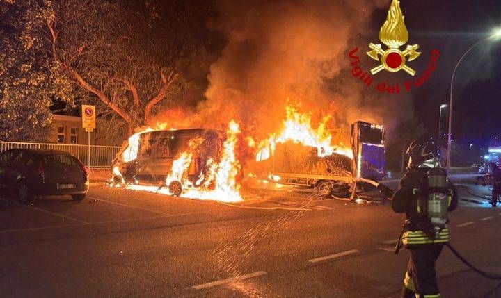 Il secondo incendio è avvenuto intorno alle 2.30 nel comune di Cesano Boscone in via Libertà 30. A prendere fuoco in questa circostanza due furgoni con all’interno derrate alimentari.