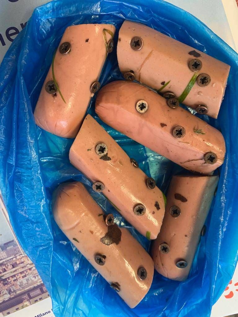 Si tratta di pezzi di wurstel trapassati da alcune viti di metallo.