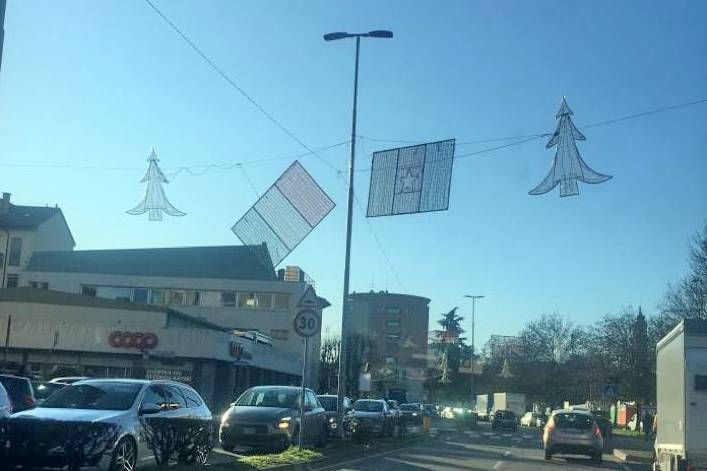 E’ successo nella centralissima via Vittorio Veneto, dove le luminarie che raffigurano le bandiere dei paesi del mondo si sono staccate. Il vento le ha fatte ondeggiare pericolosamente sulla carreggiata dove sono transitano auto e pedoni. Qualcuno ha segnalato la situazione in Comune e ai tecnici di Gaia che interverranno per ripristinarle.