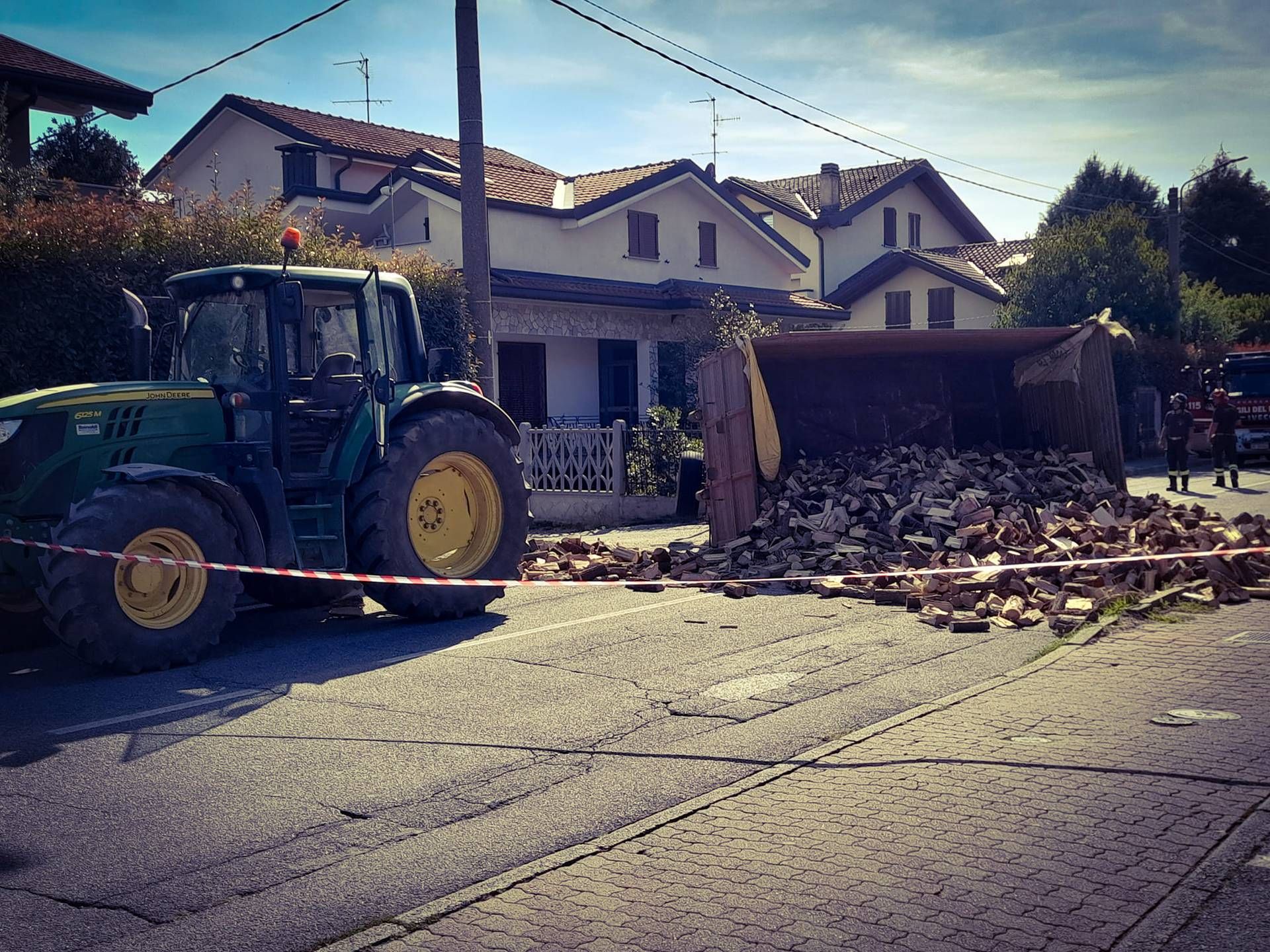 Camion ribaltato a Cesate. Ha perso il carico di legna che trasportava tranciando anche un tubo del gas. Pomeriggio movimentato con pompieri in azione per ore.