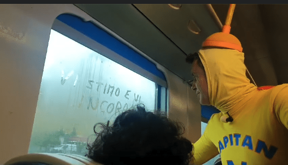 Dopo avere girato il servizio che sarà mandato in onda in una delle prossime puntate di Striscia la Notizia, Capitan Ventosa ha lasciato ai pendolari il suo motto scritto con un dito su un finestrino appannato: “Vi stimo e vi incoraggio!”, aggiungendo poi la rima “che viaggiooooo”