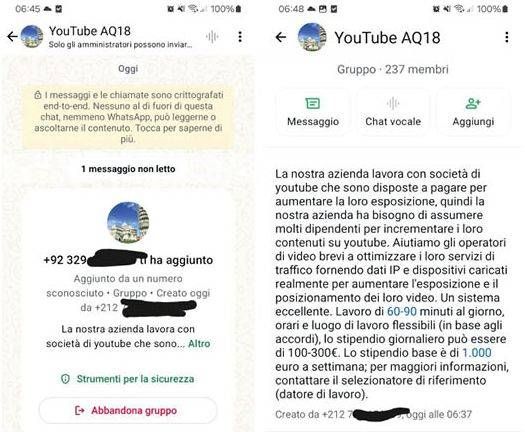 Negli scorsi giorni una cesatese ha raccontato l’ennesima truffa in cui, non solo non è cascata, ma che ha anche documentato con alcuni screenshot direttamente dal suo telefono cellulare. La dinamica è molto semplice, ci si ritrova inseriti in un gruppo di whatsapp, in questo caso il nome della chat era “Youtube AQ18” creata e popolata da numeri sconosciuti con prefissi delle Filippine e degli Stati Uniti, in breve la donna si è trovata sommersa da messaggi e inserimenti di nuovi numeri, di cui molti italiani, e si è vista fare una proposta davvero allettante da quella che si è presentata come “azienda che lavora con società youtube che sono disposte a pagare per aumentare la loro esposizione”.