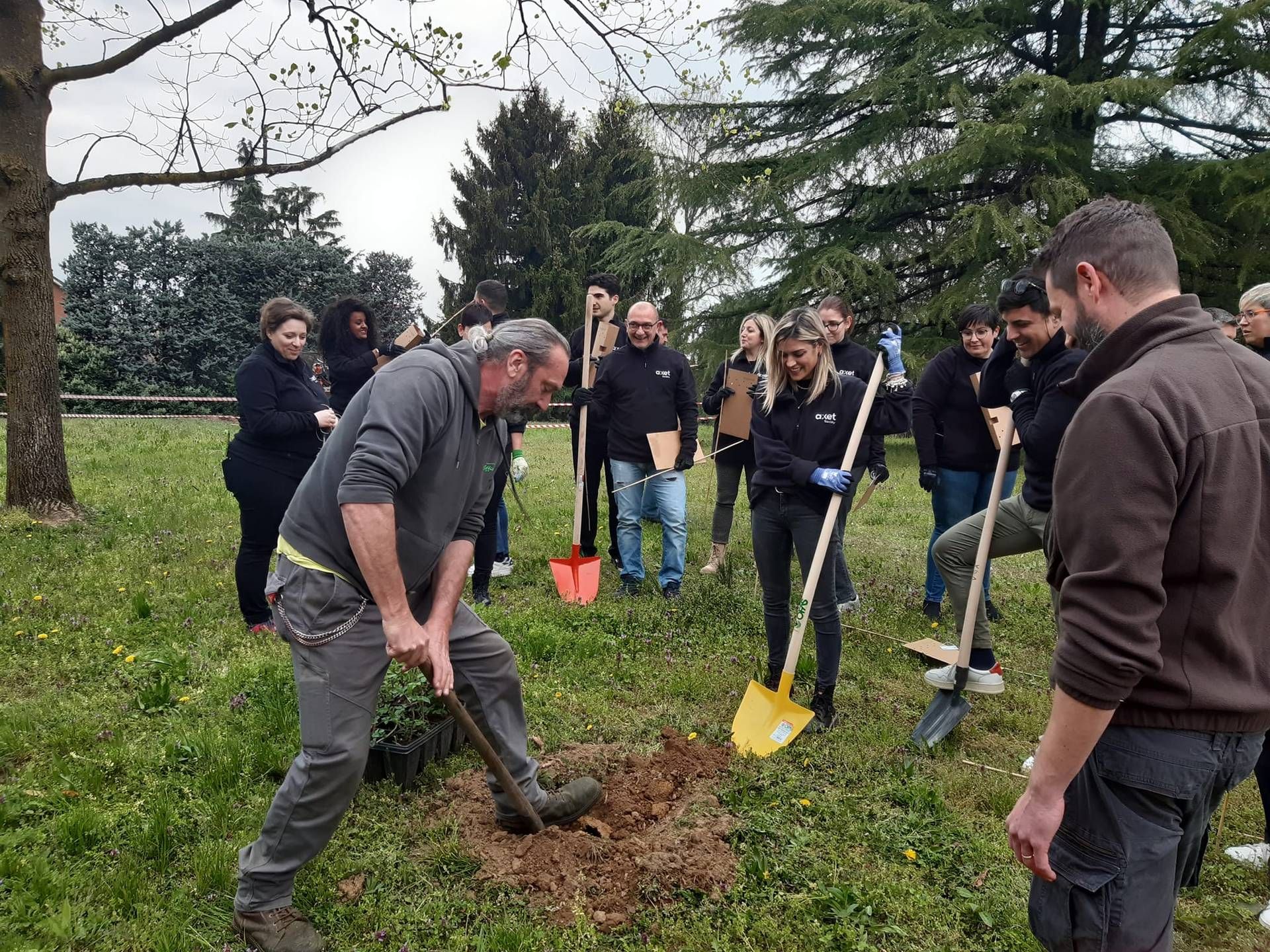 I colleghi di lavoro di un’azienda hanno piantato insieme 45 alberi nel giardino della scuola comunale dell’infanzia di Solaro di via Cinque Giornate.