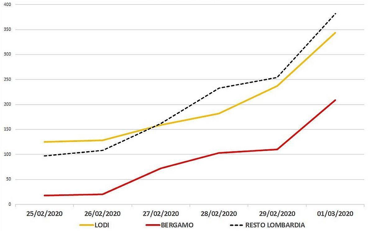 In provincia di Lodi i contagi, sempre l’1 marzo, erano 344 (di cui molti fuori dalla zona rossa di Codogno) Nel resto della Lombardia, cioè esclusa la provincia di Lodi, i contagiati trovati erano già 640.