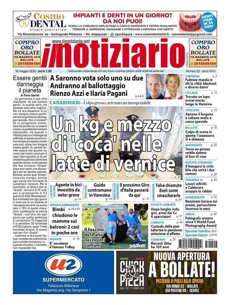 La nuova edizione del Notiziario si apre con la notizia del ritrovamento di 1,5 kg di cocaina nascosti in latte di vernice in un furgone fermato per un controllo stradale a Novate Milanese