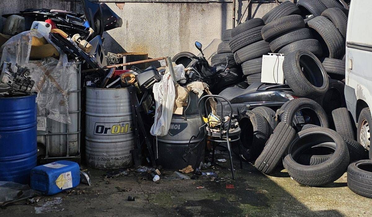 Nello spazio esterno dell’officina i poliziotti hanno individuato un ammasso di rifiuti speciali e pericolosi che occupava un volume di circa cinquanta metri quadrati. Il deposito, accumulato disordinatamente nel tempo e lasciato in totale stato di abbandono, comprendeva una grande varietà di materiali di scarto: dai furgoni e scooter ormai dismessi a circa settanta pneumatici accatastati, oltre a numerosi ricambi meccanici, componenti in plastica, imballaggi e persino un forno a microonde.