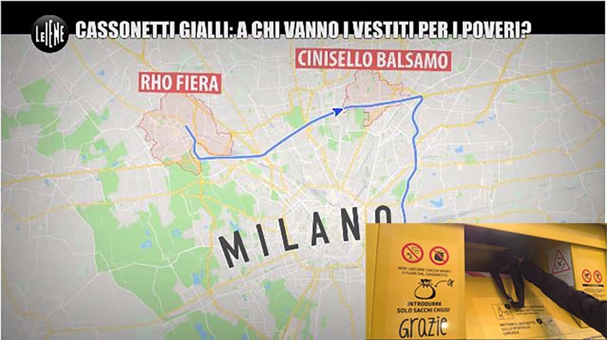 A parlarne è Luigi Pelazza nel servizio andato in onda ieri sera su Italia1. Per dimostrare questo giro che frutterebbe milioni di euro ha nascosto un gps all’interno di una borsa, che ha lasciato in uno dei cassonetti gialli di Milano in zona Rho Fiera. Al mattino gli operatori della cooperativa raccolgono i vestiti, che vengono poi smistati in un deposito a Cinisello Balsamo.