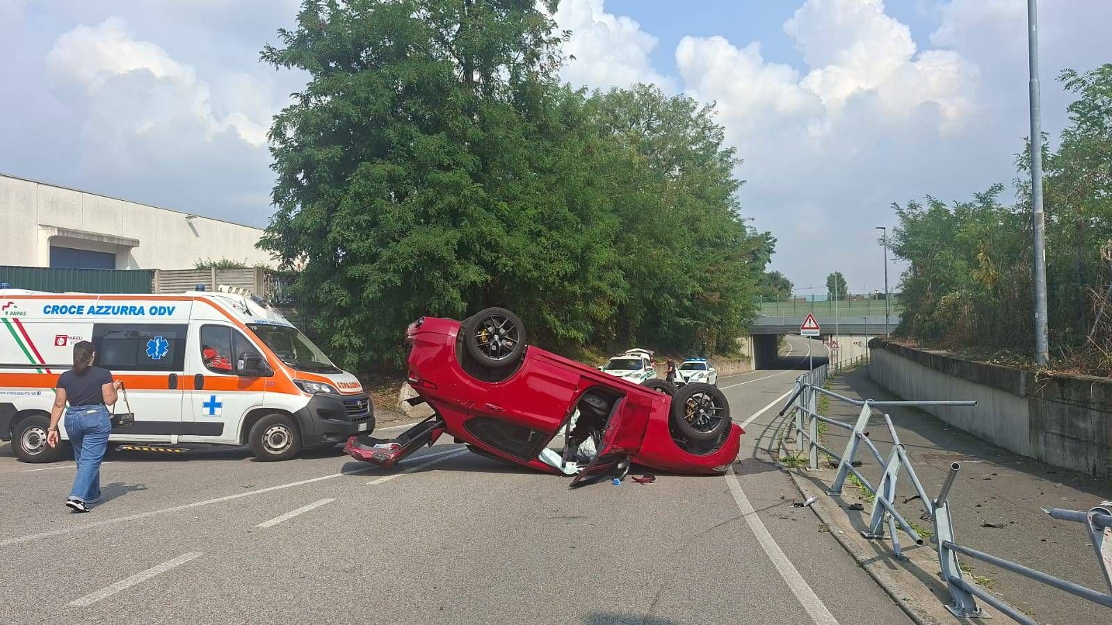 Incidente a Origgio in via Monfalcone, dove un’auto si è ribaltata: salvo per miracolo il conducente.