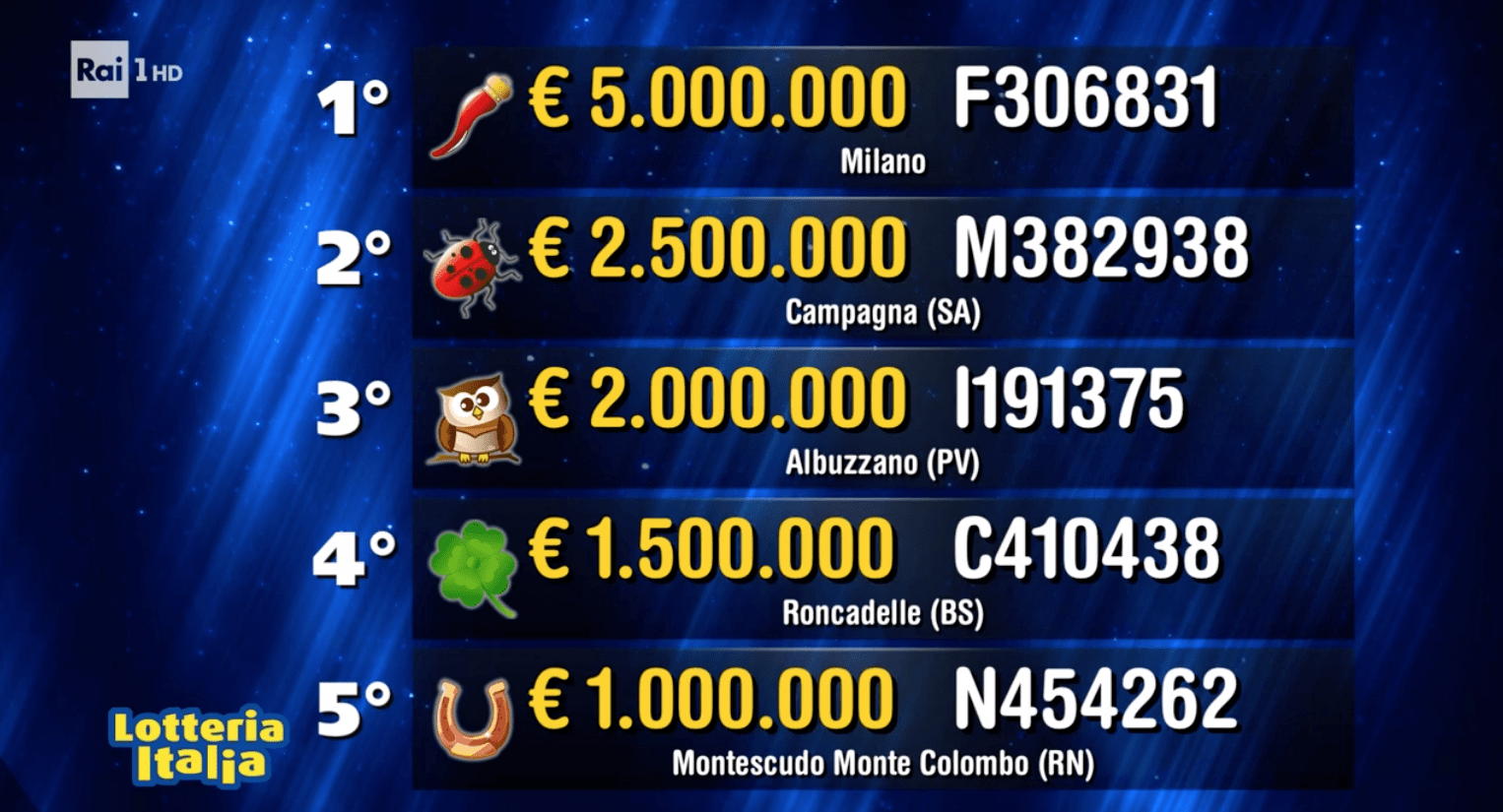 Il biglietto del primo premio da 5 milioni è stato venduto a Milano, la matrice fortunata è F306831. Per il secondo premio da 2 milioni e mezzo si va a Campagna in provincia di Salerno con il biglietto M382938. Per il terzo e quarto premio – rispettivamente da 2 milioni di euro e da un milione e mezzo – si torna in Lombardia. Il terzo biglietto estratto è quello con matrice I191375. Invece, il quarto ha numero C410438. Infine, per il quinto premio da 1 milione il biglietto vincente è stato venduto a Montescudo in provincia di Rimini.