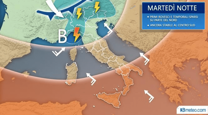 Il cambiamento vero e proprio arriverà nella notte tra martedì e mercoledì, con rovesci e temporali che prenderanno il sopravvento su tutta la Lombardia.