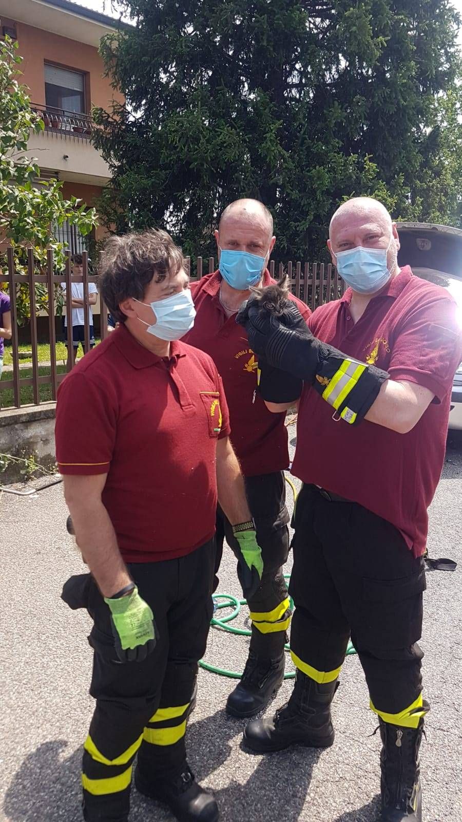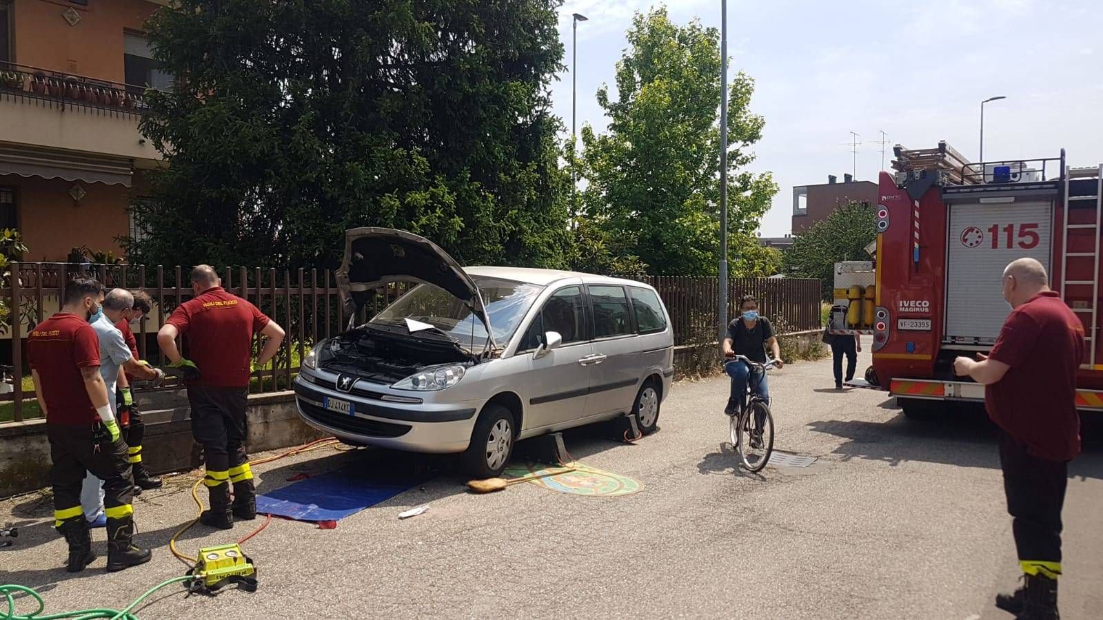 Durante la sosta ha scoperto di avere un gatto di poche settimane incastrato nel motore e fortunatamente vivo. A quel punto ha allertato i Vigili del Fuoco di Garbagnate che sono arrivati con una squadra per il pronto intervento.