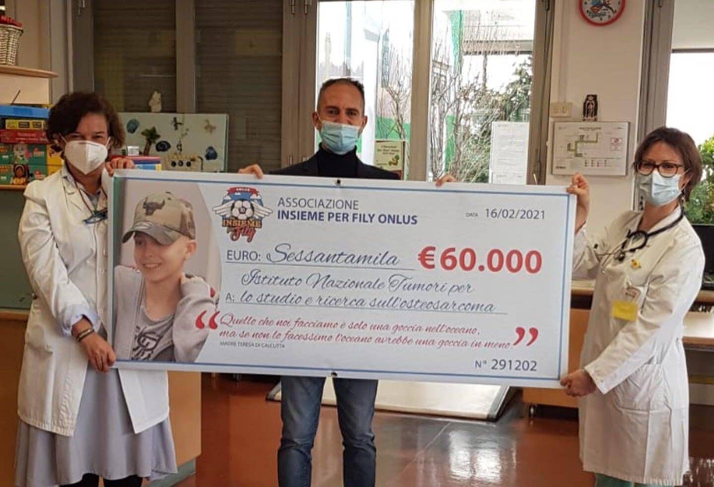 Nel terzo anniversario della morte di Filippo Finocchio, scomparso a soli 15 anni per un tumore, l’associazione Insieme per Fily, nata per mantenere il suo ricordo con iniziative di solidarietà, ha consegnato un assegno di 60mila euro all’Istituto dei tumori di Milano.