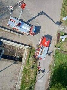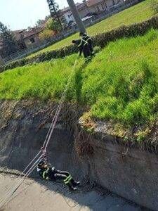 I pompieri, considerati i due casi di ciclisti caduti nel canale Villoresi, hanno approfittato della secca per effettuare un’esercitazione “in scenario”, simulando il recupero di una persona caduta in acqua e soccorsa con manovre Saf.