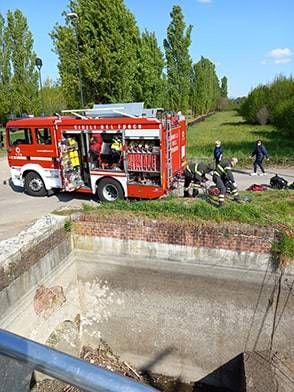 I pompieri, considerati i due casi di ciclisti caduti nel canale Villoresi, hanno approfittato della secca per effettuare un’esercitazione “in scenario”, simulando il recupero di una persona caduta in acqua e soccorsa con manovre Saf.