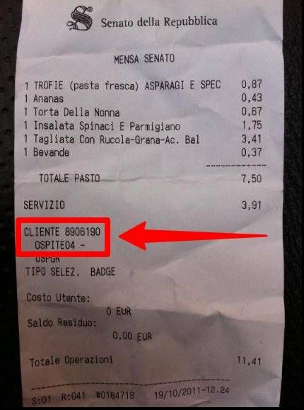 Lo scontrino con le trofie al pesto a 87 centesimi e la tagliata con rucola, Grana a aceto balsamico a 3 euro e 47 centesimi è del 19 ottobre 2011. Il 28 ottobre del 2011 chi fu a svelare la bufala, pubblicando uno scontrino del “Ristorante del Senato?”.