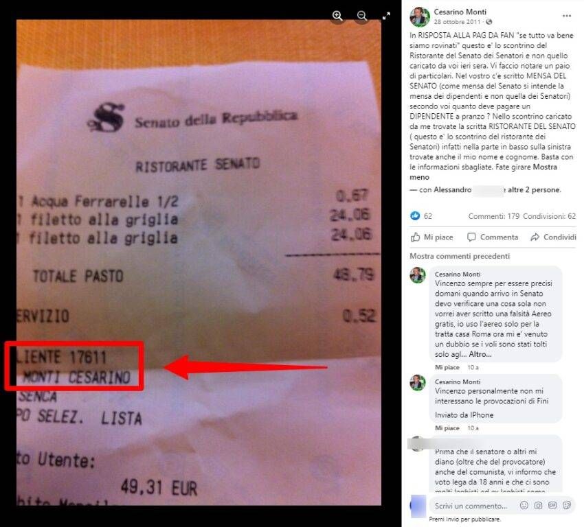 Proprio Cesarino Monti, in risposta alla pagina Facebook “Se tutto va bene siamo rovinati”, come ha ricordato Open, pubblicando lo screenshot del post di Cesarino nel quale spiega che il primo scontrino è quello della “Mensa del Senato”, ovvero il servizio riservato ai dipendenti del Senato, una mensa per i lavoratori del palazzo (commessi, segretari, amministrativi, uscieri, manutentori, assistenti), mentre i parlamentari mangiano al “Ristorante del Senato” dove i prezzi sono decisamente più in linea con il mercato, come dimostra lo scontrino pubblicato dallo stesso senatore Cesarino Monti, con un filetto alla griglia a 24,06 euro (siamo sempre nell’ottobre 2011).