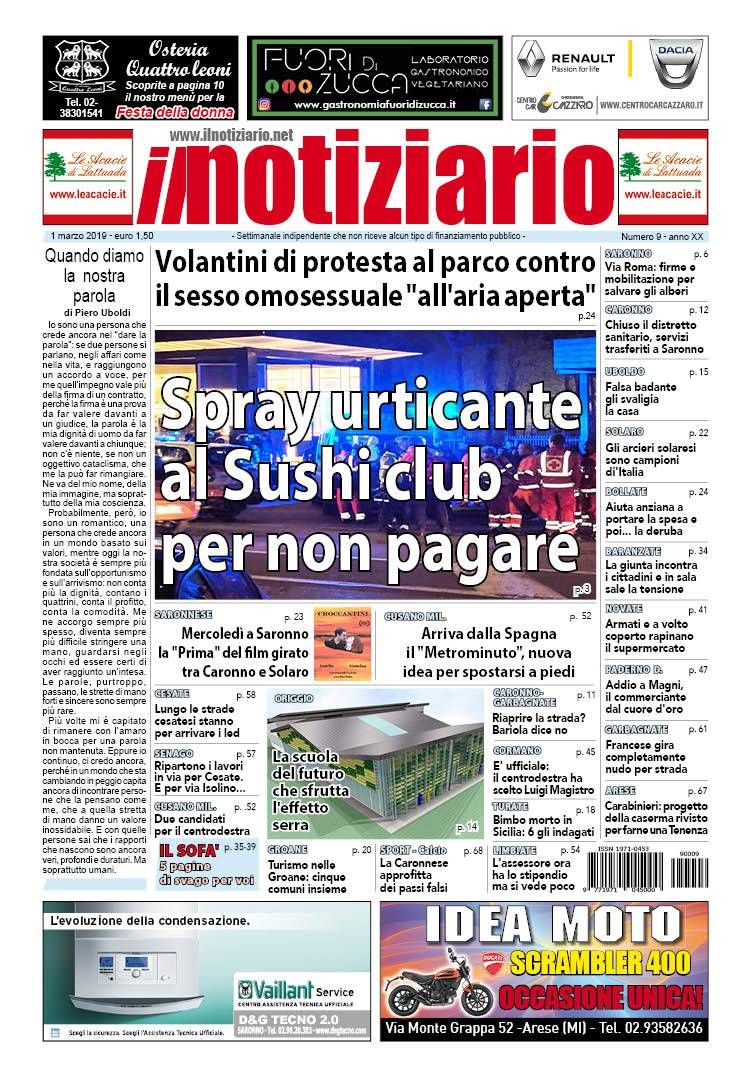 Questo nuovo numero de “il notiziario” si apre con la notizia di un incredibile episodio verificatosi sabato scorso in un ristorante giapponese a Saronno, dove qualcuno ha diffuso spray urticante che ha provocato malessere e disagi a 17 persone: pare che sia stato fatto da un gruppo di ragazzi con l’obiettivo di allontanarsi dal locale senza pagare.
