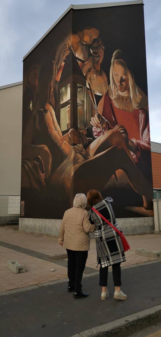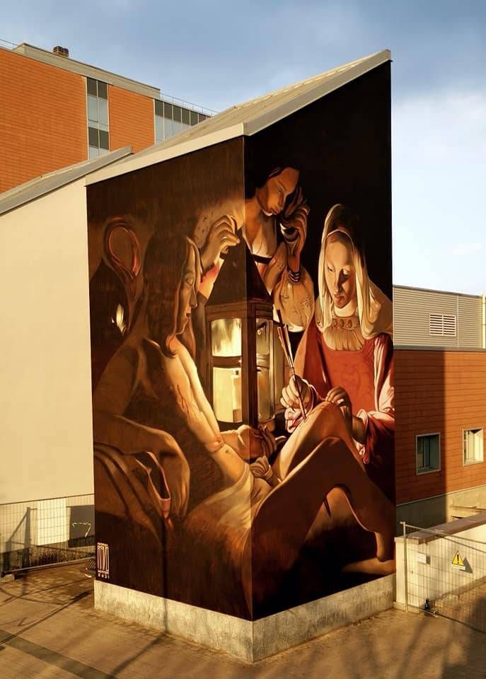 L’opera scelta per quest’ultimo dipinto dell’artista varesino, che ha già realizzato diverse opere murali di grandi dimensioni su edifici pubblici e privati è “San Sebastiano curato da Irene” di Georges De La Tour. Si tratta di un dipinto realizzato a metà del XVII secolo dal pittore francese, esponente del Barocco e fortemente influenzato dal Caravaggio. Il dipinto originale si trova al Museo del Louvre di Parigi.