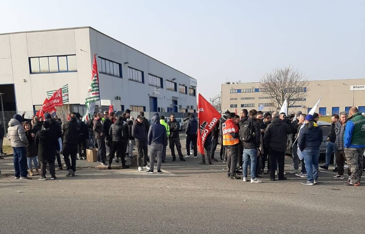 La mobilitazione degli addetti alle consegne di Amazon, fiancheggiati dalle organizzazioni sindacali, prosegue: hanno incrociato le braccia nel piazzale d’ingresso a oltranza, gridando slogan.