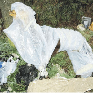 Nel corso di un pattugliamento del territorio, l’agente ha notato vicino alla chiesetta quello che sembrava un animale avvolto dal cellophane: in effetti è bastato avvicinarsi per constatare che si trattava di una capretta imbalsamata.
