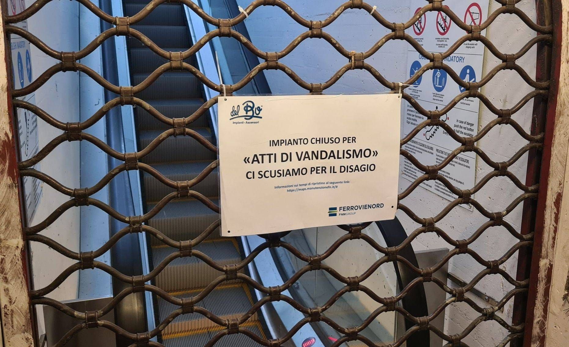 La scala mobile del binario 6 dello scalo ferroviario di Saronno, collegamento strategico con il retrostazione attraverso il sottopassaggio centrale, è di nuovo fuori uso per vandalismi: saracinesca abbassata e un cartello eloquente annunciano l’ennesimo stop.