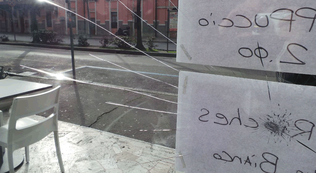 Tornati al bar una delle vetrate, la più esterna, quella vicina ad un negozio chiuso, mandata completamente in frantumi.